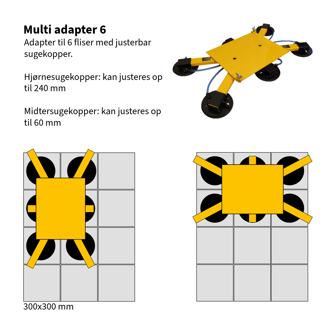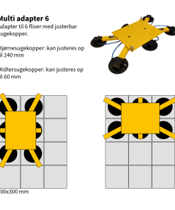 Hver sugekop er justerbar og kan rykkes op til 100 mm, hvilket giver mulighed for at bruge adapteren til aflange fliser lagt i forbandt.